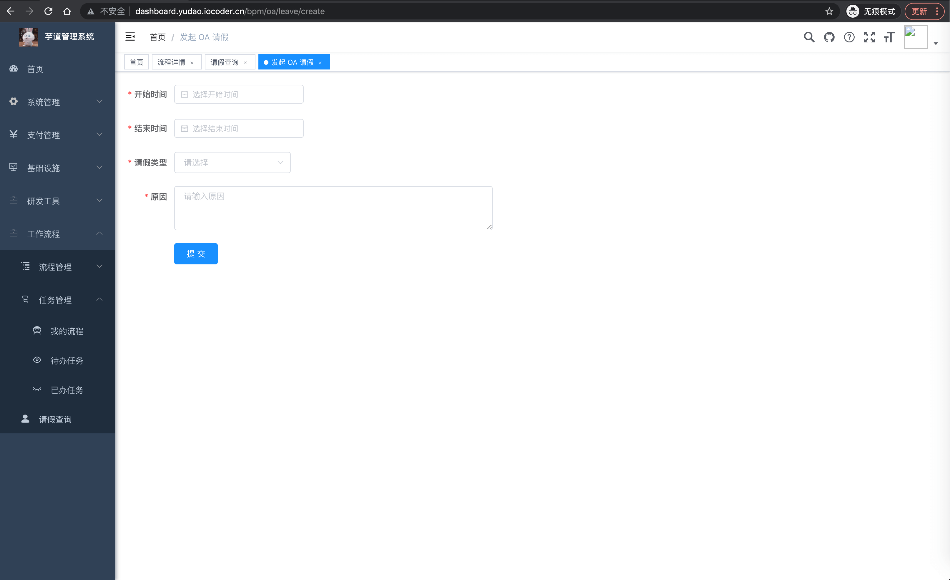 OA 请假 OA请假-列表 OA请假-发起 OA请假-详情